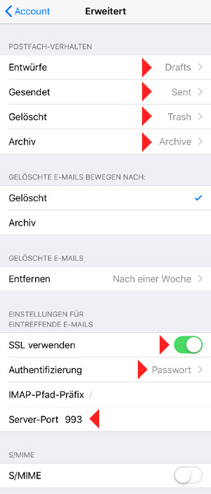 Tippen Sie auf Einstellungen Passwörter & Accounts bluetronix Mail Account (...Ihre Email-Adresse...) Erweitert.
